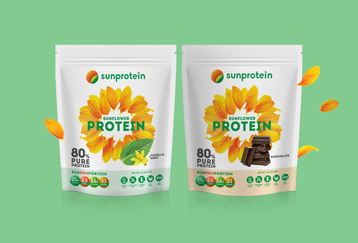 Branding and packaging design for Sunprotein — an all-natural and vegan friendly protein mix produced from sunflowers.